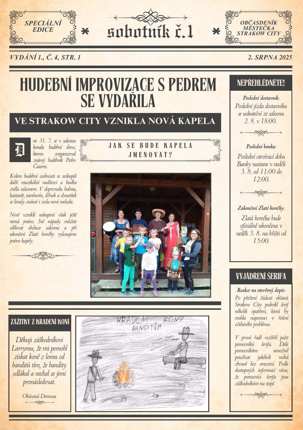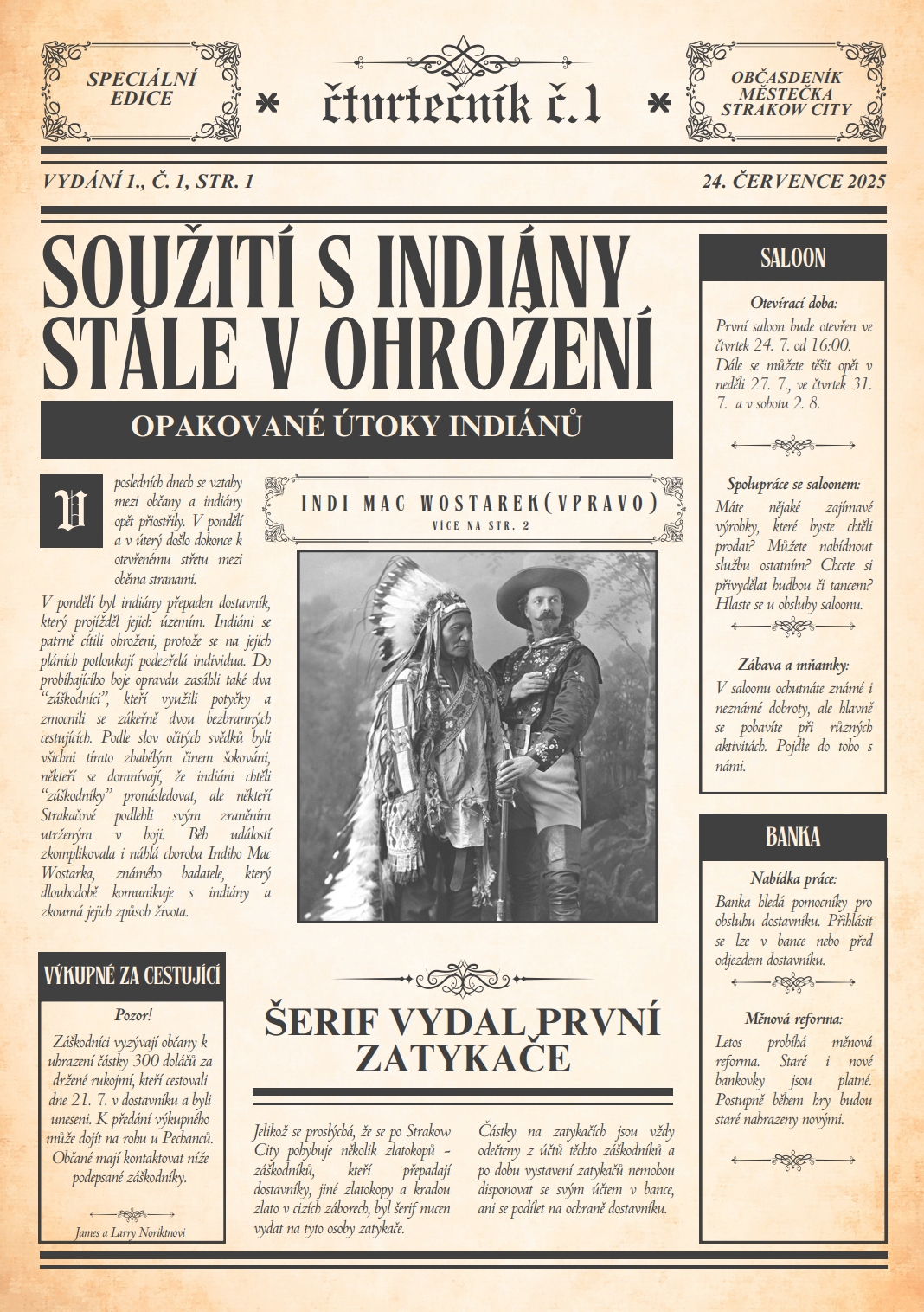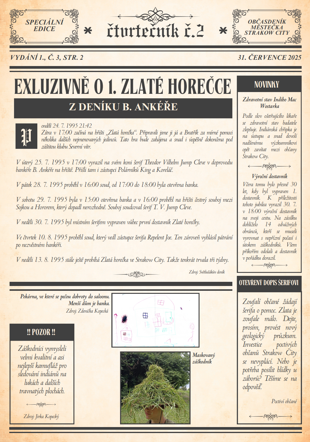 V místní knihovně opět sídlí redakce novin Strakow City. Své příspěvky můžete dodávat ve středu 30. 7. 2025 tam v čase 16:30 – 18:30. Nebo do schránky domu č.p. 102 u Světlušáků. Všechny otištěné příspěvky budou honorovány. Autoři příspěvků si mohou vybrat, zda obdrží jednorázovou částku v doláčích nebo jim bude vytvořena speciální jubilejní 25doláčová bankovka, na které budou oni sami.