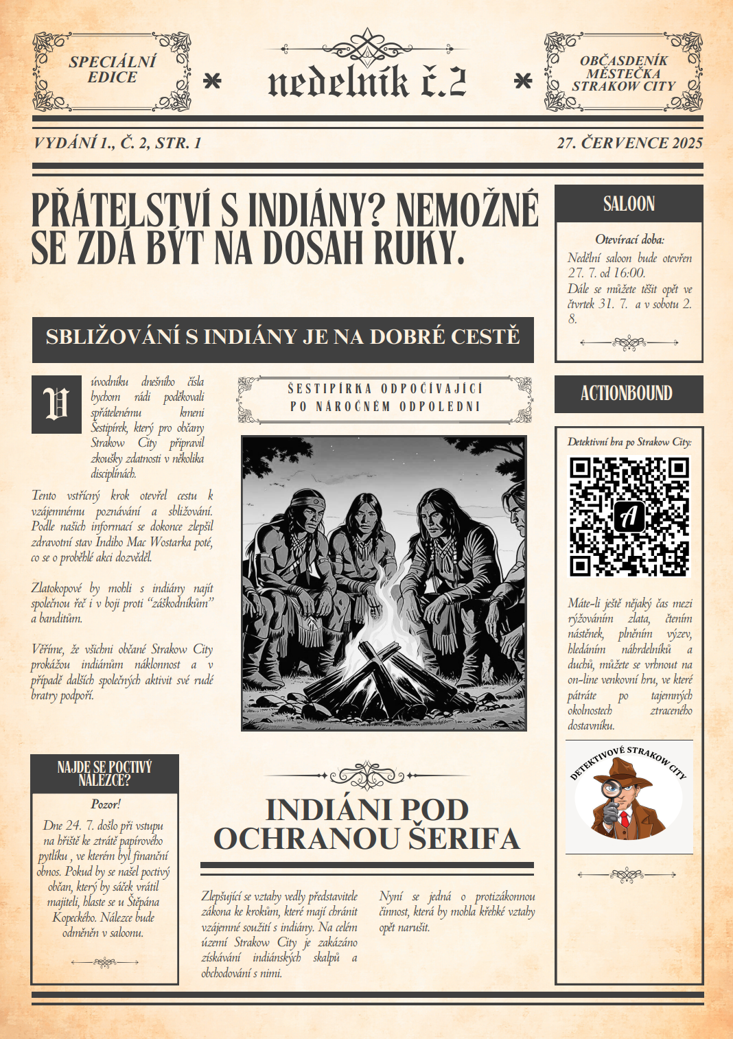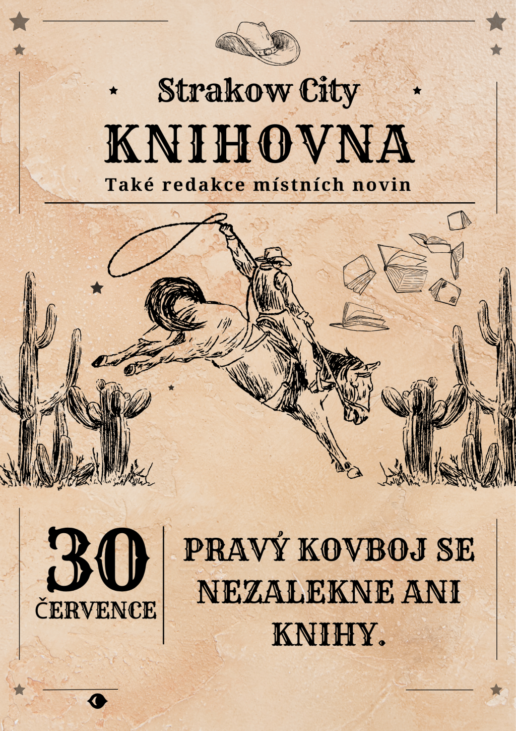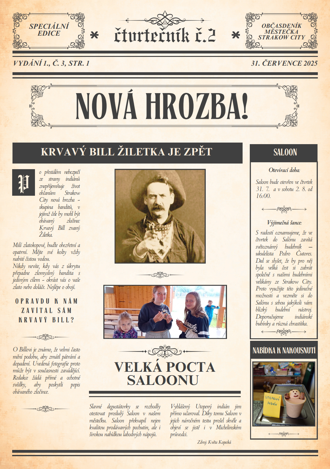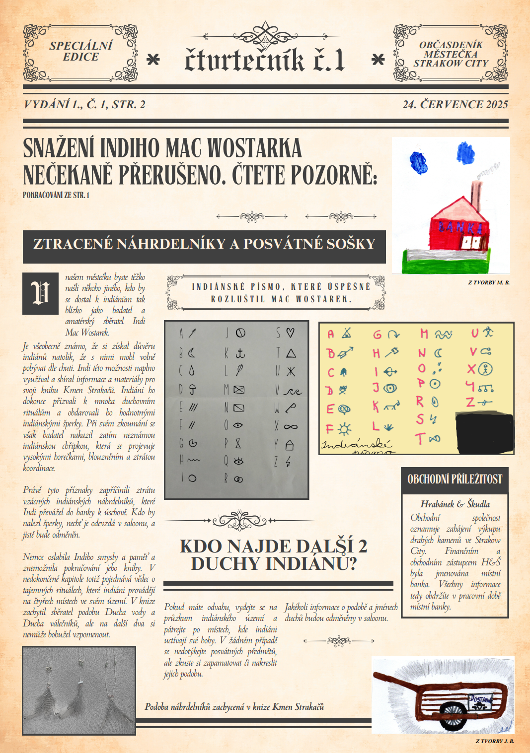 V místní knihovně opět sídlí redakce novin Strakow City. Své příspěvky můžete dodávat ve středu 30. 7. 2025 tam v čase 16:30 – 18:30. Nebo do schránky domu č.p. 102 u Světlušáků. Všechny otištěné příspěvky budou honorovány. Autoři příspěvků si mohou vybrat, zda obdrží jednorázovou částku v doláčích nebo jim bude vytvořena speciální jubilejní 25doláčová bankovka, na které budou oni sami.